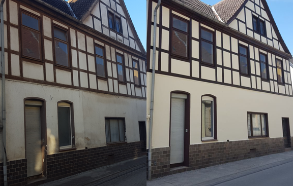 Bei der Grünen Tanne war offensichtlich, dass die Jahre ihre Spuren hinterlassen hatten. Die äußere Erscheinung ließ vermuten, dass es sich einst um ein hübsches Gebäude gehandelt hatte. Obwohl die Aufgabe ziemlich groß schien, entschieden wir uns, es zu versuchen. Zuerst suchten wir das Gespräch mit dem Eigentümer, um gemeinsam Lösungen zu finden und dem alten Haus neuen Glanz zu verleihen. Hunderte von Rissen an der Fassade wurden von vielen fleißigen Helfern des Projekts "Farbe für Egeln" sorgfältig gefüllt. Wir erneuerten sogar die Giebelecke und den Stuck. Heute präsentiert sich die Grüne Tanne stolz in einem neuen Kleid als eine alte Dame, die von vielen engagierten Helfern liebevoll restauriert wurde.